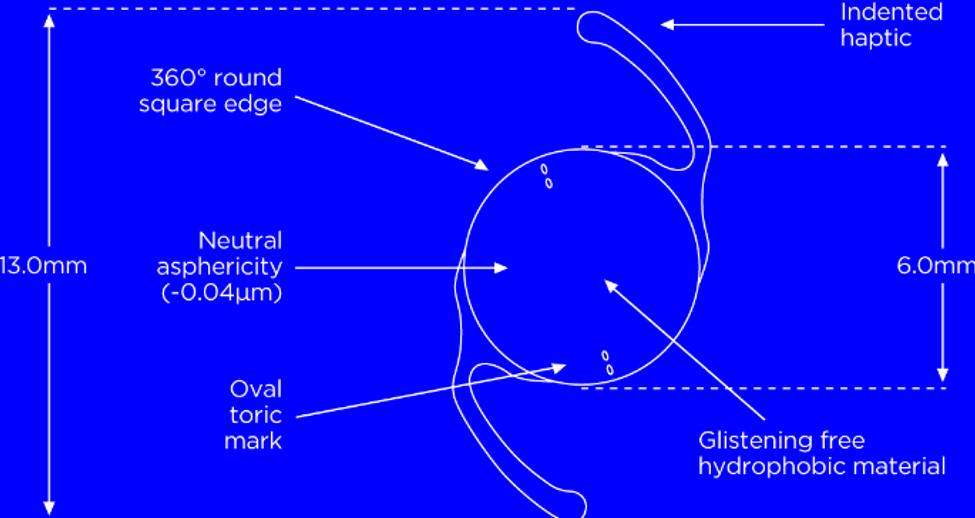 Proven Rotational Stability Reliable Post-Operative Outcome: The 1-piece lens design with modified C-loop haptics and an indented surface provides high rotational stability within the capsular bag, ensuring the astigmatism correction remains precisely aligned over time.
