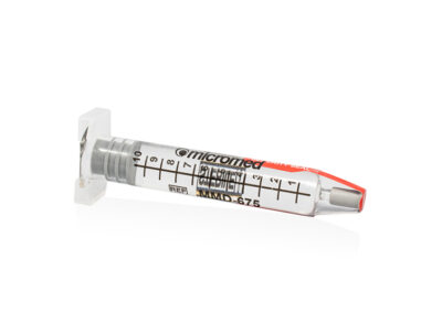 The Micromed PDMS Glass Syringe device consists of a glass syringe pre-filled with 10cc of silicone oil (1000 cSt, 1300 cSt, 2000 cSt, 5000 cSt), the kit is completed by the presence of a lure lock adapter and a 23g cannula.
